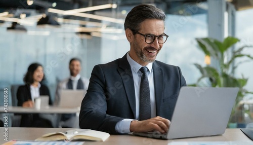 Smiling mature adult business man executive sitting at desk using laptop