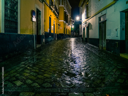 Streets of Seville at night in a rainy day