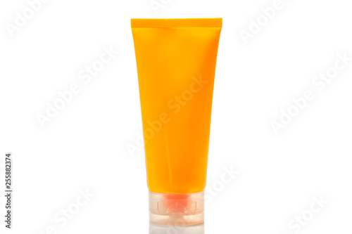 Sunny orange colored beauty cosmetics tube; branding mock up isolated on white. Trendy neon color.