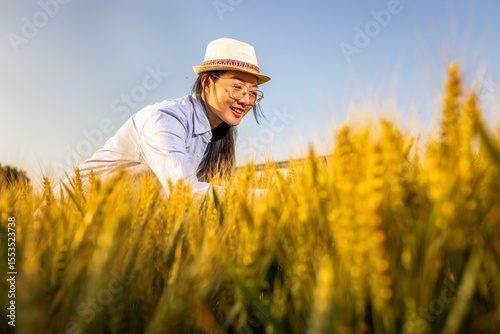 : Thai Woman Farmer Smiling While Holding Wheat in Golden Field