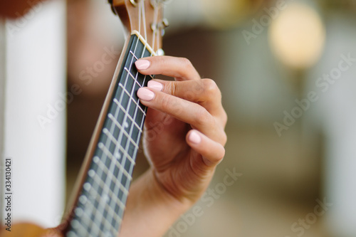 The girl plays on the ukulele, fingers clamping the chord of a guitar.