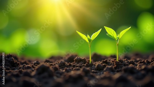 - Tiny coffee plants, vibrant leaves, sunlight dappled earth, natural growth cycle, serene outdoor scene, promising future, bean, green, future