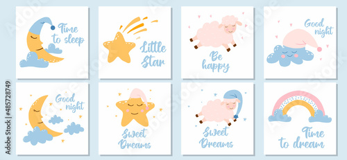 Vector set of good night posters. Hand-drawn cute set of postcards with cute clouds, sheep and stars.