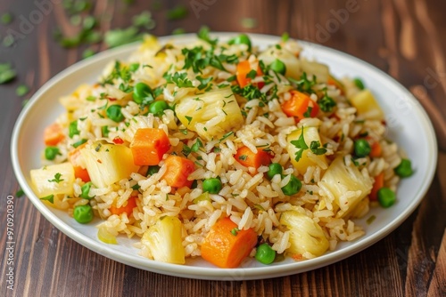 Vegan fried rice with pineapple, carrots and peas, balanced vegan meal