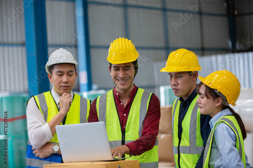 Warehouse worker meeting. Employee asian people using laptop in factory