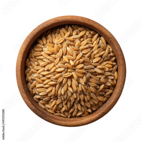 wheat grain in a small wooden bowl, isolated background