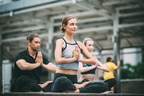 yoga and healthy lifestyle concept. group of sporty people practicing yoga lesson with instructor. yoga in the city
