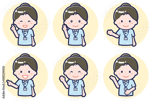 woman, adult, occupation, nurse, welfare, helper, care, staff, nursing home, waist up, front, smile, joyful, fun, happy, positive, happy, enjoyment, positive, light, lively, greeting, pease, expression, feeling, icon, pose, sweet, people, set