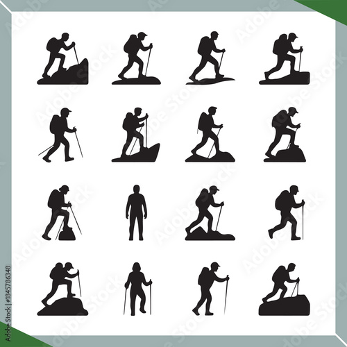 hiking, trekking, backpack, hiker, silhouette, people, adventure, outdoors, walking, travel, nature, mountain, pole, explore, scheme, vector, activity, graphic, walk, journey, vacation, lifestyle, summer, silhouette, black