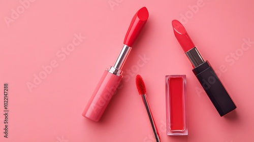 overhead, view, liquid, lipstick, applicator, resting, pink, background, keep company, lip, gloss, tube, brush, coral, surface, arrangement, be, visually, appealing, ample, space, text, or, branding, beauty, cosmetic, make-up, make-up, red, cosmetic, fashion, colours, glamour, isolated, object, nubes, lip, accessory, make up, love, shiny, constructed, care, woman