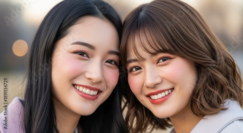 japanese, woman, smile, model, heartthrob, artist, beauty, chum, two people, closeup, pretty, beautiful girl, advertisement, friendship, youth, lifestyle, nature, portrait, open air, dusk, happy, fun, cosmetic, fashion