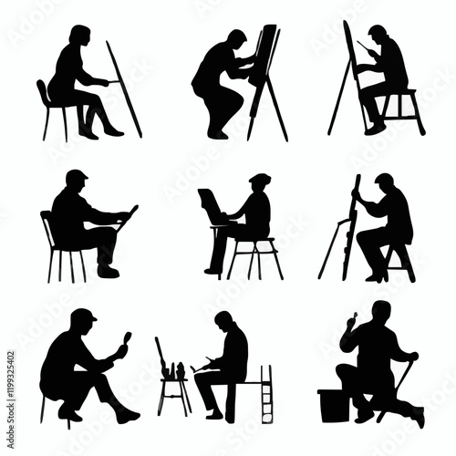 10 black simple silhouette depictions of humans performing various professional activities on a white background