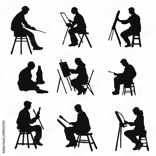 10 black simple silhouette depictions of humans performing various professional activities on a white background