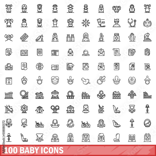 100, baby, icon, set, outline, collection, signs, symbol, object, vector, illustration, isolated, thin, line, black, doll, rag, girl, dress, game, pox, irritation, allergic, body, health, certificate, birth, document, newborn, diploma, pacifier, bottle, care, nipple, soother, park, carousel, ride, amusement, attraction, children, seat, bike, bicycle, children, eltern, car, booster, safety