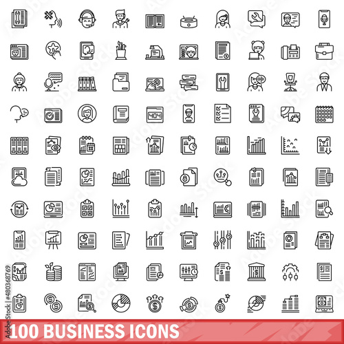 100 business icons set, outline style