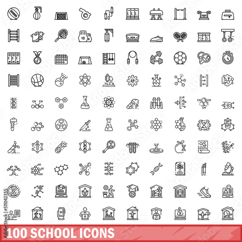 100, school, icon, set, outline, collection, signs, symbol, object, vector, illustration, isolated, thin, line, black, gym, club, equipment, room, bag, exercise, fitness, health, dressing, sport, backpack, gymnastics, chemistry, laboratory, chemical, molecular, physics, science, laboratory, medicine, research, flask, test, atom, education, home, training, physical exercise, fit, pilates, yoga, house, balance, student