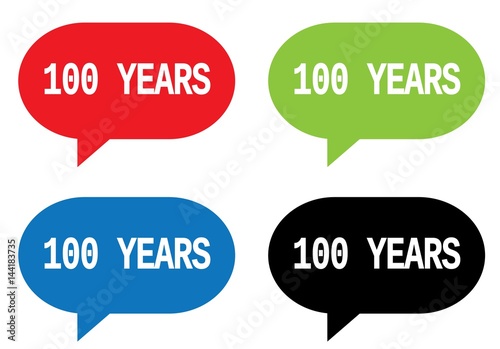 100 YEARS text, on rectangle speech bubble sign.