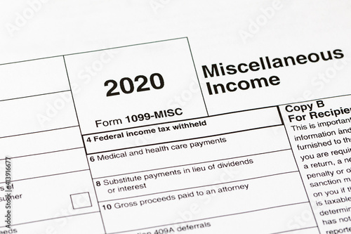 1099 miscellaneous income tax form. Concept of income taxes and federal tax information.