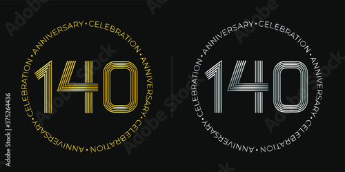 140th birthday. One hundred and forty years anniversary celebration banner in golden and silver colors. Circular logo with original numbers design in elegant lines.