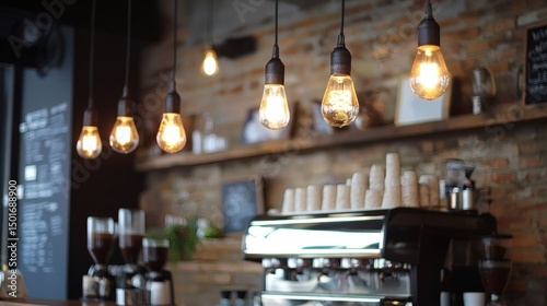 18. Cafe interior featuring soft ambient lighting with industrial fixtures