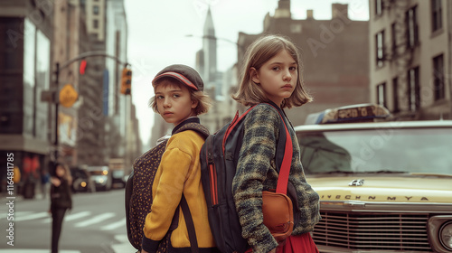 1970s school fashion, kids with backpacks, vintage city backdrop