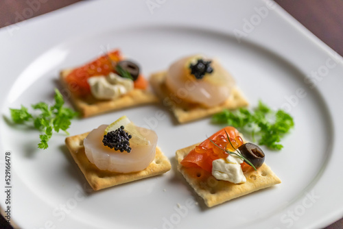 白皿に並べられた、海鮮をトッピングしたクラッカー。スモークサーモンにイクラ、オリーブを乗せたものと、ホタテにキャビア、レモンを乗せたものの2種類。パーティーのオードブルやバルの軽食メニューを紹介する販促・広告用素材に。 | Crackers topped with salmon, ikura, scallop, and caviar.