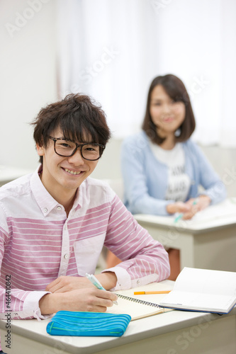 japanese, young, happy, noto, pen, lifestyle, chair, indoor, school, study, student, fun, glasses, table, training, classroom, seated, possess, youth, school, woman, smile, waist up, people, man, college, adult, man, fellow, chum, peer, two people, friends, campus, youth