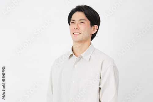 man, smile, smile, smile, white background, portrait, young, look up, cool, good-looking, shirt, waist up, japanese, alone, asian