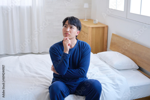 man, contemplate, pajama, morning, unrest, bedchamber, bedchamber, hesitate, young, home, bed, seated, apprehension, uprise, trouble, house, room, nightwear, awake, indoor, indoor, stir, japanese, asian