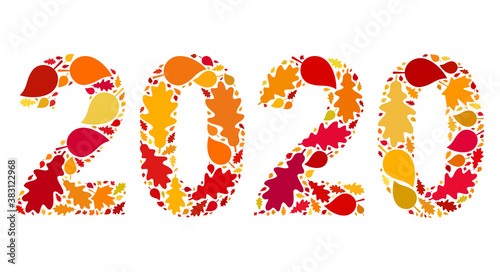 2020 Year Digits mosaic icon done for fall season. Vector 2020 year digits mosaic is done of scattered fall maple and oak leaves. Mosaic autumn leaves in bright gold, brown and red colors.