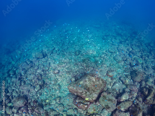 岩場で休む美しく大きなアオウミガメ(ウミガメ科)。 日本国静岡県伊豆半島賀茂郡南伊豆町中木から渡し船で渡るヒリゾ浜にて。 2022年夏水中撮影。 A beautiful, large green sea turtle (Chelonia mydas, family Turtles) resting on a rocky beach. Hirizohama beach, by ferry fr