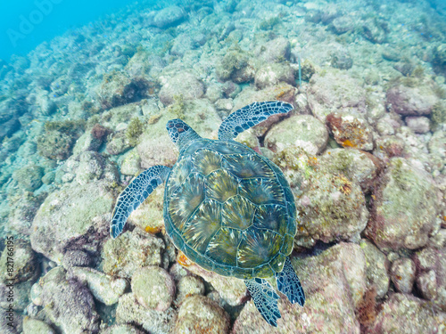 ゆったり泳ぐ美しく大きなアオウミガメ(ウミガメ科)。 日本国静岡県伊豆半島賀茂郡南伊豆町中木から渡し船で渡るヒリゾ浜にて。 2022年夏水中撮影。 The Beautiful and large green sea turtle (Chelonia mydas, family Turtles). Hirizohama beach, by ferry from Nakagi, Minami-