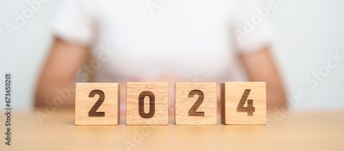 2024 year block on table. goal, Resolution, strategy, plan, start, budget, mission, action, motivation and New Year concepts