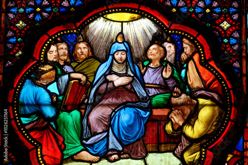 2024-08-02, Paris, FRANCE. Stained glass of Pentecost Sunday: The Holy Spirit Comes and descending on disciples as Tongues of Fire. .