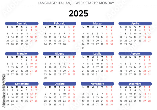 2025 year calendar. Italian language. With 12 months. Printable vector illustration Italy