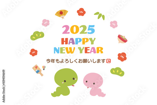 2025年巳年の年賀状デザイン、かわいいへびと賀詞と挨拶文01