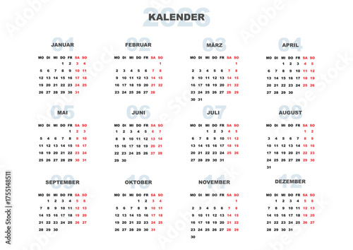 2026, calendar, year, german, template, month, planner, new, layout, monthly, date, week, day, planning, vector, horizontal, page, schedule, annual, german, german, german, business, corporate, minimalist, organiser, concept, diary, grid, 12, office, modern, clean, bold, minimal, wall, desk, illustration, design, web, graphic, isolated, stationery, digital, printable, professional