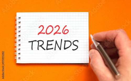 2026 Trends new year symbol. Concept words 2026 Trends on beautiful white note. Beautiful orange paper background. Businessman's hand with pen. Business and 2026 Trends new year concept. Copy space.