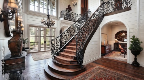bright, airy, antechamber, rustic, wood, staircase, intricate, wrought, iron, railing, wall, warm, hardwood, flooring