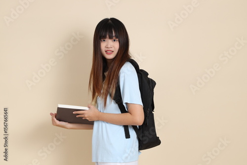 portrait, asian, 20s, young, adult, woman, female, japanese, chinese, girl, person, woman, teenage, asian, accident victim, standing, student, summer, casual attire, youth, teenage, holiday maker, shirt, short, college, education, graduation, school, campus, study, university, abroad, book, holding, hand, reading, paper, blank, learning, backpack, notebook, cognition, hobby, bag, classroom, homework, workbook, academic