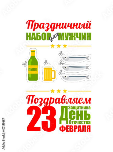 23 February. Mens set. Beer and fish. Comic postcard. Sofa troops Set for men. Mens holiday in Russia Translating Russian text: Defender of Fatherland Day.