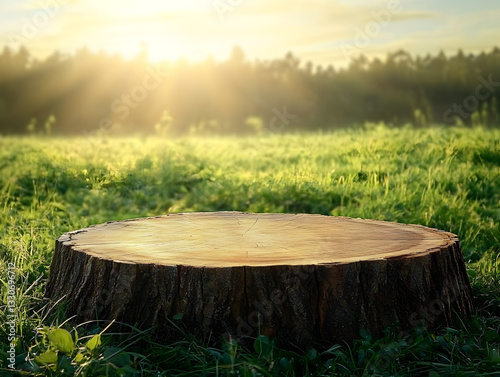 2408 1.A rustic wooden podium made from tree slices stands in the middle of a sunlit farm field, surrounded by fresh green grass. Soft morning sunlight filters through, casting a warm glow over the