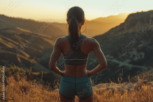 2410_087.rear view outdoor portrait, athletic wear against sunset backdrop, rugged mountain terrain, misty valley shadows, wilderness romance scene, golden sunset photography
