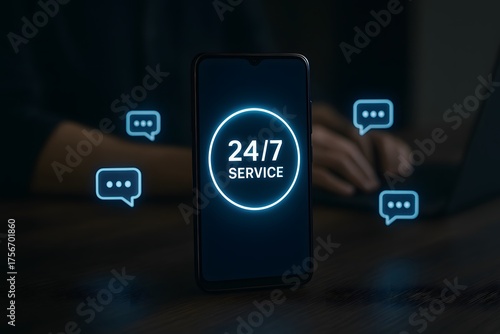 24/7 Service on smartphone screen representing customer support and communication concept.