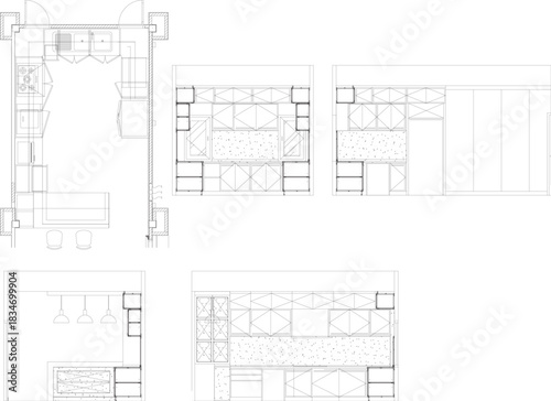 2D Interior Design Drawing of Built-in Kitchen Layout with Sink, Gas Stove, Refrigerator, Microwave, and Interior Elevations