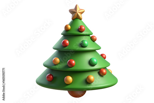 christmas tree, three-dimensional, cartoon, holiday, festive, decoration, ornament, star, green, red, orange, yellow, festive season, celebration, winter, seasonal, christmas, object, symbol, stylised, digital artwork, graphic, isolated