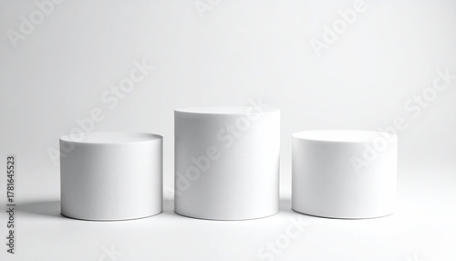 3 white cylinders, various heights, minimalist stage-like