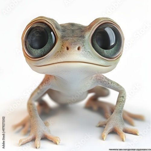 36. "Create a 3D image of a small creature with large, expressive eyes, isolated against a pristine white background.