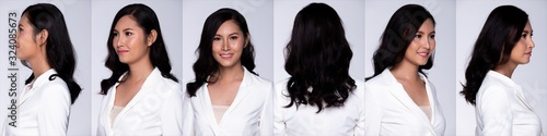 360 Portrait Snap Figure, Asian Business Woman Transgender wears White Suit pants black hair and acts many poses expression, studio lighting white background isolated collage group