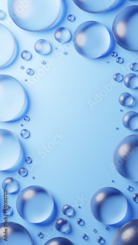 水色背景に複数の透明な丸いガラス。俯瞰。コピースペース。3D(縦長)